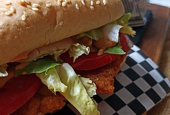 Para el montaje, untamos bien ambos el pan con la salsa de burguer, en el de abajo ponemos 2 lonchas de bacon, después el pollo, el queso, tomate y lechuga. Cerramos con el otro pan previamente untado con salsa de burguer.