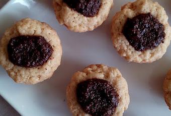 En los moldes engrasados para mini cupcakes, colocamos la masa en bolitas de una pulgada de diámetro aproximadamente, y con nuestros dedos presionamos el centro para hacer espacio para el relleno.
