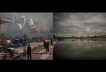 Pasado y Presente es un díptico que he creado con una foto de un Guggenheim recién finalizado y que tenía todavía que compartir espacio y perspectiva con los rastros de la antigua ciudad industrial; la otra foto que compone el díptico es la Ría a la altura de Lamiako, símbolo de un pasado de astilleros y altos hornos. Lo que he conseguido es que la primera imagen entrara en la segunda para crear esta sensación de pasaje no traumático para Bilbao y sus ciudadanos.
