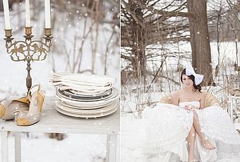 Buen martes a todos! Lo sabemos: al ver esta fotografía de portada, solo podemos pensar que le han hecho photoshop a los dedos morados de la novia!!! Qué frío... Jajaja! Pero cada vez están más de moda las bodas en invierno, debido al ahorro que puede suponer respecto a casarse en primavera o verano, por los importantes descuentos. Así que, no hay frío que no arregle un buen abrigo!Casarse en invierno tiene su encanto, las fotos de las bodas en esta época del año tienen una luz especial. Aquí os traemos una recopilación de imágenes gracias a las fotos de Jenny Haas, con el estilismo y el diseño de Ashley Krogman, especializada en el diseño de bodas y eventos.Una boda con una singular puesta en escena, con cierto aire rústico vintage, en donde los muebles y accesorios antiguos cobran vida y protagonismo.Multitud de pequeños detalles que la hacen única, como el reloj en el árbol, las lámparas encima de la mesa con tazas colgantes o el ramo a base solo de piñas. El resto, una gama de colores simples, como plata, cremas, blancos y dorados, y poco más hace falta con ese paisaje de fondo.