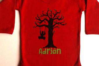 Este body tenía que tener dos colores principales, rojo y negro, un árbol con un columpio y un niño columpiándose. Añadimos el nombre y unas hojas en verde para añadirle un poco del color complementario de la prenda.