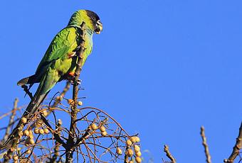 Unas fotos del pasado 11 de junio en la RECS, donde es típico ver a las ñanday (Aratinga nenday) devorando frutos de paraíso (Melia azedarach) una exótica ornamental que en algunos lugares se ha asilvestrado, a los cuales llamamos "bolillas de paraiso" en mi pueblo y en el campo. Estos psitácidos andan siempre en bandadass, estos se posaban un poco alto esta vez lo que impidió tomar fotos limpias sin que interfirieran ramas aunque se alcanza a ver bien su forma de alimentación.