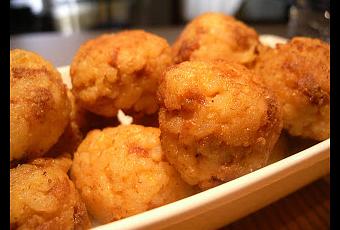 Hace mucho tiempo que vi esta receta en el blog de "Hermanas Golosas", y la guarde para hacerla algún día. Reconozco que lo que mas me llamo la atención era lo de hacer bolitas con el arroz y luego freírlas sin que se desmoronaran, no se por que pero me hacia mucha gracia. Mi experiencia satisfactoria, pero hay que ver lo que el arroz se me pegaba en las manos, de hecho abandone en el primer intento y metí la mezcla en la nevera con el fin de endurecerla y que fuera mas fácil. El segundo intento fue mucho mejor. He empleado mas o menos las mismas cantidades de la receta original y le he añadido parmesano, que me encanta, y me salieron unas 25 bolas.
