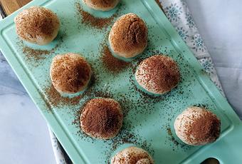 Nos engrasamos las manos con mantequilla y hacemos bolas de unos 25 - 30 gramos. Dejamos en una bandeja y después espolvoreamos canela o cacao en polvo.