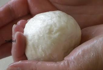 aplastamos y acariciamos y estiramos, para que se unan los cubos de queso.... acuerdense que esto lo tenemos que hacer dentro del agua caliente...