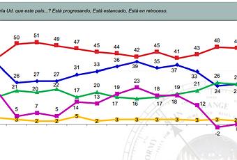 “El progreso es limitado en el conjunto de países latinoamericanos , con la excepción de los bolivianos donde un 44% percibe progreso, seguido de Chile y República Dominicana con 33%, en todos los otros países la percepción de progreso es menos de un tercio de la población. Hay tres países donde la percepción de progreso no alcanza el 10%. Venezuela (6%), Brasil (6%) y El Salvador (9%). La ausencia de progreso es una buena medida del malestar generalizado del pueblo latinoamericano”.
