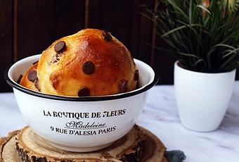 Pasado el tiempo, desgasificamos, le vamos clavando los dedos para quitar las burbujas que se han ido formando, estiramos la masa y ponemos pepitas de chocolate, cogemos porciones de 50 gr y vamos metiendo hacia dentro los bordes, para tener una bola, dejando la parte tensionada hacia arriba.Colocamos en una bandeja de horno con papel, separadas entre si. Tapamos y dejamos levar de nuevo.Pasado el tiempo pincelamos con huevo,ponemos alguna pepita mas y metemos en el horno precalentado a 180ºC durante 15 minutos.Dejamos enfriar sobre rejilla.