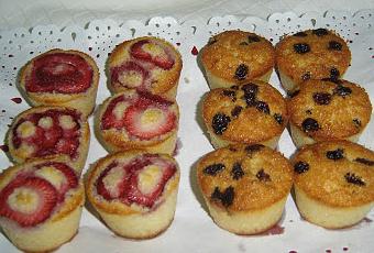 Precalentar el horno a 200º.Engrasar con mantequilla unos moldes de magdalenas (yo utilicé unos de silicona que tienen 6 unidades juntasFundir la mantequilla y reservar hasta que se enfríe.Tamizar el azúcar glas y la harina juntas en un bol. Añadir las almendras molidas y mover mejor con las manos.Batir en otro cuenco las claras hasta que forme una espuma ligera (no llegar a montar punto de nieve).Hacer un hueco en la harina y verter las claras y la ralladura del limón, incorporar la mantequilla y formar una masa suave.Repartir la masa en el molde y poner los arándanos por encima de cada bollito, si has elegido poner fresas, también.Hornear entre 15 a 20 minutos hasta que estén dorados.Dejar en el molde 5 minutos más y desmoldar en una rejilla.Si quieres puedes espolvorear con azúcar glas.