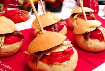 Rellenar los panecillos colocando pimiento asado en la base, crema de queso, tiras de pimiento encima, una anchoa y un boquerón.