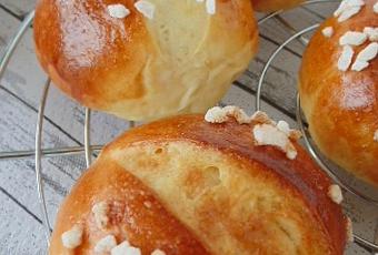 Haremos unas bolitas de 60 grs. que iremos disponiendo en una bandeja de horno con papel vegetal. Dejamos que doble de nuevo, de media a una hora aproximadamente. Todo depende de la temperatura de la casa en ese momento. Hacemos un corte en el centro, pintamos con huevo batido y decoramos con azúcar perlado.Horneamos unos 10 minutos a 200 grados. Retiramos cuando estén dorados por arriba y por abajo. Cuidado que se doran muy rápido.Vamos disponiendo en una rejilla mientras sacamos del horno. Dejamos enfriar. Al ser bollería del día debemos pensar los que vamos a necesitar. Lo que no consumamos se puede congelar en bolsitas para alimentos. Los envuelvo en papel film de manera individual y cuando me apetecen, los dejo descongelando unas horas antes o la víspera si son para el desayuno.