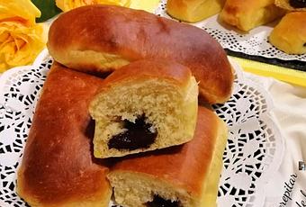 Colocar los bollos de leche rellenos, con la parte sellada hacia abajo y separados entre si, sobre una bandeja de horno forrada con papel vegetal. Barnizar la superficie con huevo batido y fermentar por segunda vez hasta que tripliquen su volumen.