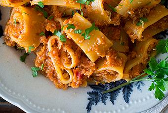 En cuanto a la pasta, mejor corta y con un buen agujero para que recojan bastante pasta, lo vais a agradecer, yo he usado una pasta que traje del último viaje a Italia y que reservaba para una ocasión especial, se llama calamarata por la similitud con las anillas del calamar y la verdad es que le ha ido genial, si no encontráis, podéis usar paccheri, que son más populares.
