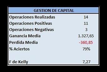 este año en el que el Ibex no ha subido (de momento) tanto como el año pasado vemos que el % de acierto ha bajado a un 53% aunque seguimos comprobando que en cada operación buena ganamos casi 800 € mientras que en cada operación perdedora se nos van -417 € es decir que cada buena aproximadamente nos cubre dos malas.