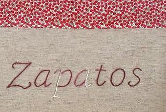 Otra bolsa que he regalado, en esta ocasión para llevar los zapatos.He probado el hilo de la Finca matizado en burdeos y el resultado final no me ha gustado, porque en su parte más clara es prácticamente blanco y se lee mal.