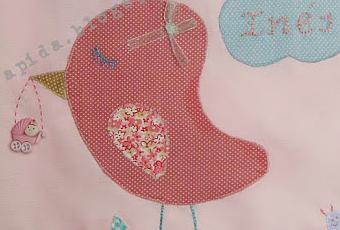 Y esta bolsa en tonos azules me la encargó para la colada, con el nombre bordado a mano y la flor en relieve.