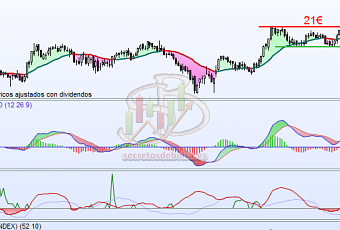 La cotización se encuentra próxima al nivel de precios donde dijimos que la llegaríamos a ver, los 29,60€. En esta zona se encuentra el máximo histórico, valor que no se toca desde noviembre del 2007 y que nos daría paso en caso de atravesarlo a la subida libre, sin condiciones.