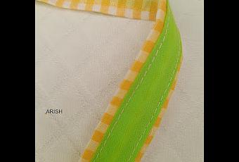 El interior lo he hecho con cuadritos vichy en amarillo al igual que la parte de atrás que va personalizada con el nombre.