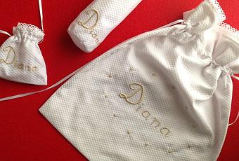 Hola chicas, buenos días. Hoy os traigo algo más de lo que he preparado para Diana. En esta ocasión los colores que mandan son el blanco y el camel. Bolsita para el chupe, bolsita para el bibi y otra para la mudita. Todas ellas con el nombre de la peque bordado. Buen Jueves.