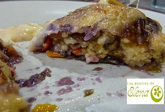 Hacemos una bechamel a la que le añadimos una cucharadita de curry, se la añadimos por encima a los saquitos, rallamos por encima queso y metemos en el horno.