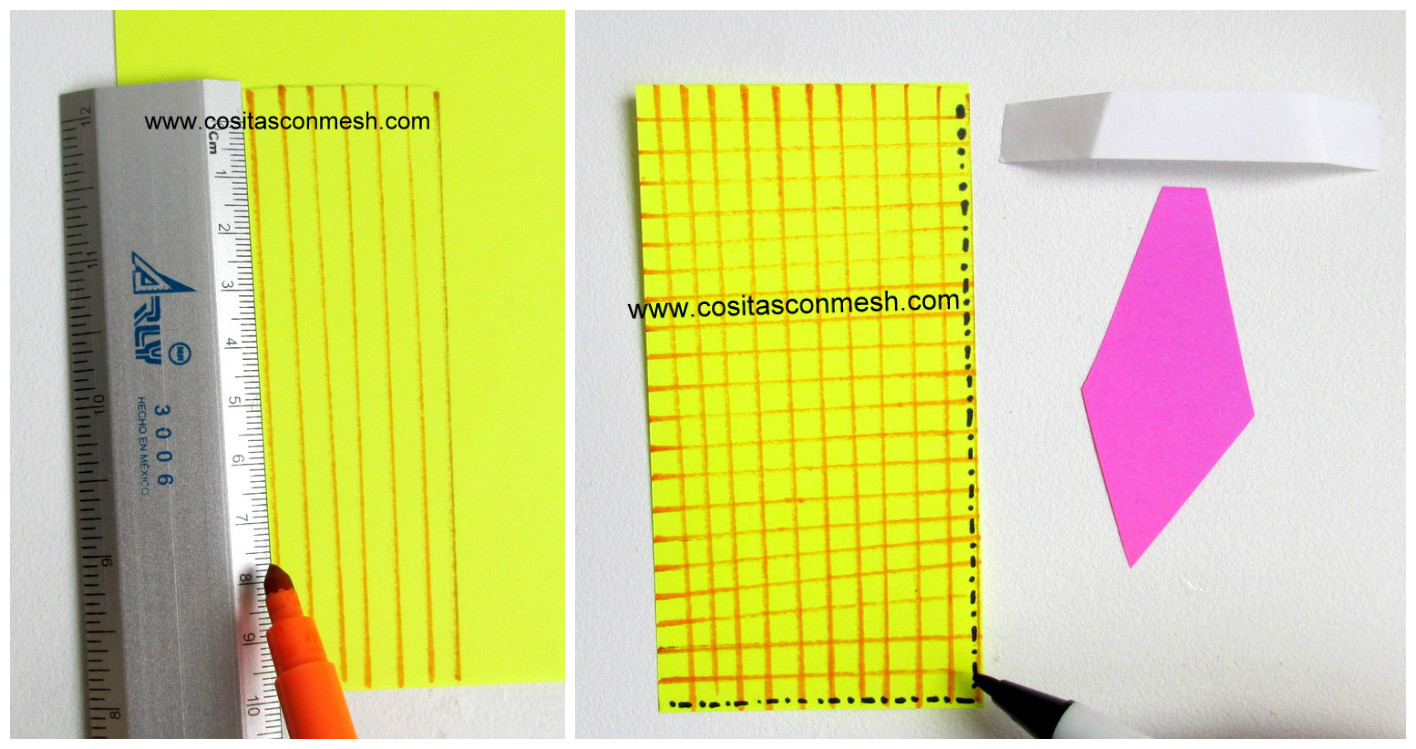 6.-Con una regla y plumón naranja, dibujamos una cuadricula en cartulina amarilla.