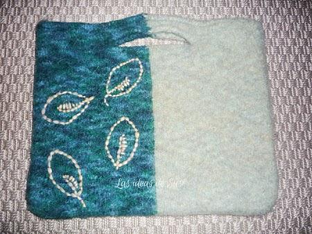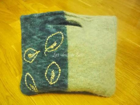 Las medidas de bolso después del felted son 30 cm de ancho y 25 de alto (no lo medí antes del felted, pero era casi el doble!). La abertura del asa mide 11 cm.