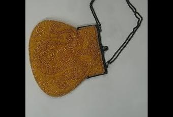 Este primer bolso, color mostaza, bordado en paillets del mismo color de la tela. Lleva aplicaciones en metal plateado, y una cadena también plateada.