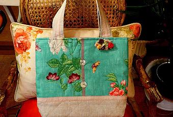 Hoy quería enseñarles este bolso. Particularmente a mi me encanta ...lo hice con la tela de tapicería que me regalo mi mejor amiga, Zita.Era un trocito de un muestrario y lo quería utilizar en un bolso porque el color verde del lino me parecía precioso, es una pena que las fotos no le hagan justicia, pero es un verde agua ¡maravilloso! con unas atrevidas mariposas en colores amarillo y violeta junto a unas flores fucsias, grises y berenjenas ...
