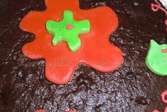 Para la tercera tarta utilicé el bizcocho básico al que le había incorporado dos cucharadas colmadas de cacao en polvo y lo rellené de dulce de leche. Preparé una cobertura de chocolate y lo cubrí completamente. Aprovechando que tenía restos del fondant, corté unas figuritas y junto con unas galletitas de Kitty adorné la tarta (eran de mi kit de emergencia por si me fallaba la tarta fondant).