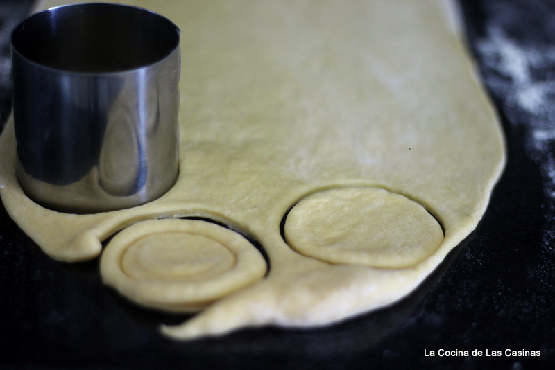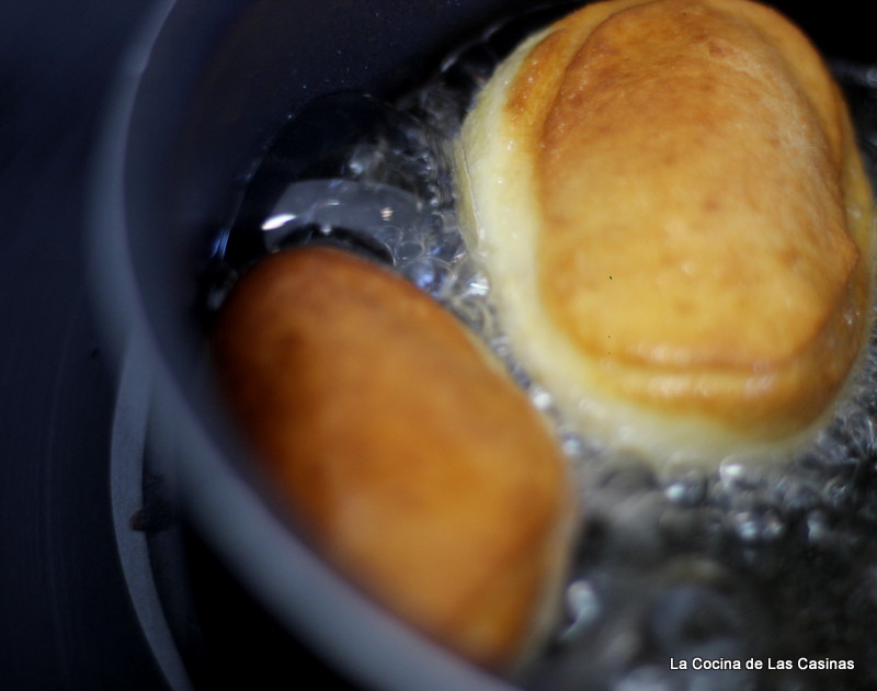 Espolvorea la encimera con harina. Extiende la masa con el rodillo en una lámina de 1 cm. de alto. Corta con un molde redondo o con una taza de café. Fríe cada masita en un cazo con abundante aceite caliente, este momento es una maravilla, mira como suflan.