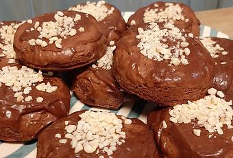 140 gr. de calabaza asada 100 gr. de dátiles sin hueso remojados en agua caliente 10 min. 35 gr. de manteca de avellanas (o avellanas tostadas trituradas en casa) 20 gr. de cacao puro en polvo 10 gr. de polvo de hornear o levadura química aceite de oliva virgen extra 45 gr. de manteca de avellanas 45 gr. de dátiles sin hueso remojados en agua caliente 10 min(yo calabaza asada) 45 gr. de agua del remojo (yo leche de avellanas) 15 gr. de cacao puro en polvo 100 gr. de chocolate puro picado 100 gr. de nata para montar caliente