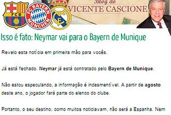 La información la recoge el blog del propio Vicente Cascione en el que dice “Revelo esta noticia de primera mano para ustedes. Ya está fichado. Neymar ya está contratado por el Bayern de Múnich. No estoy especulando, la información no se puede desmentir. A partir de agosto de este año el jugador pasará a formar parte de la plantilla del club. Por tanto, su destino, como muchos anunciaban, no serán España. Ni Barcelona. Ni Real Madrid. Él se va a Alemania”