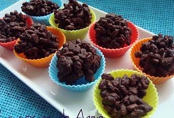 - Derretir en el microondas 100 grs. de chocolate negro 70% con 30 grs. de mantequilla. Añadir 75 grs. de arroz inflado de chocolate y mezclar todo bien.