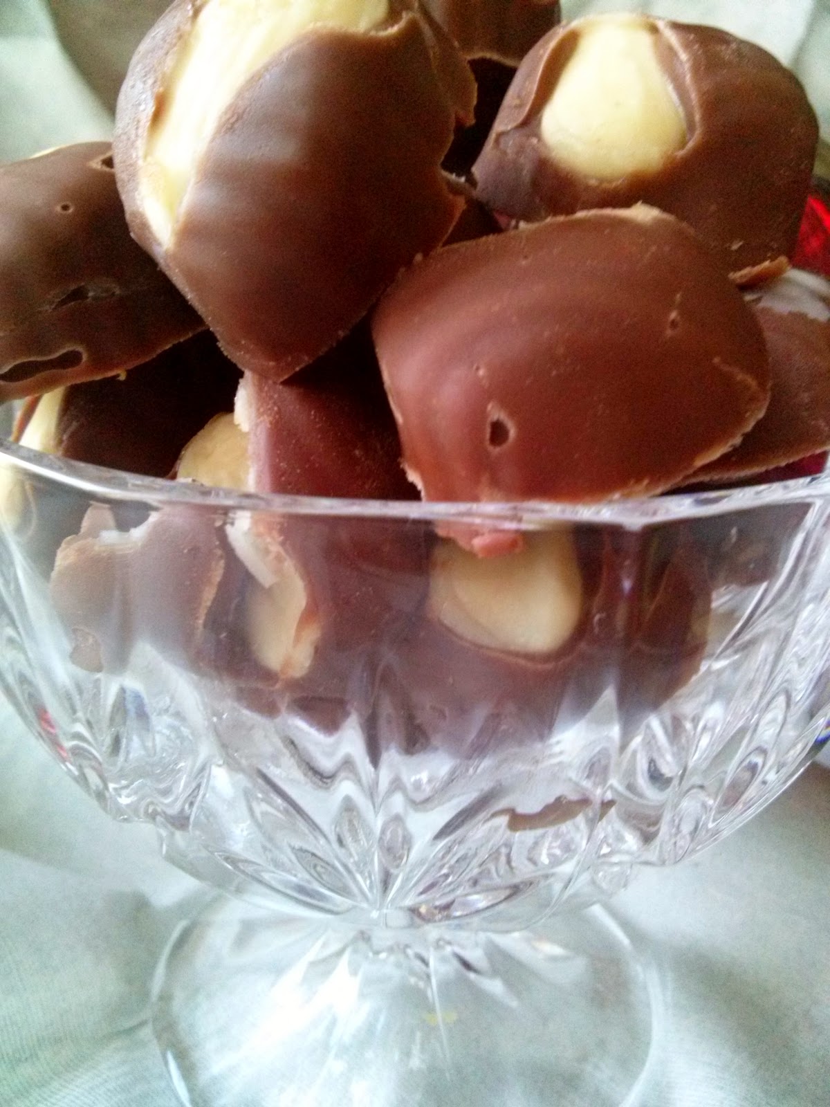 Trocea el chocolate y ponlo en un recipiente apto para el microondas junto con la mantequilla.Programa 2 minutos a máxima potencia. Saca , espera a que enfríe un poco y bate con unas varillas hasta que quede todo bien mezclado.Mete el chocolate en una manga pastelera. Coge unos moldes de silicona para hacer hielo , úntalo un poquito de mantequilla ( muy poco ) , pon una almendra en ellos y ve rellenando con el chocolate.Introduce los moldes en el frigorífico hasta que se pongan duros y puedas desmoldarlos.