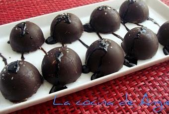 - A la hora de servir, sacarlos con cuidado de la cubitera y se disponen en un plato; poner sobre cada bombón una gota de crema de vinagre balsámico y unas escamas de sal Maldon.