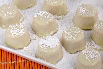 - En un cazo al baño María, derretir 200 grs. de chocolate blanco y dejar enfriar. Sacar los bombones de su molde, pasarlos rápidamente (que no se descongelen) por el chocolate blanco, y volver a congelar.