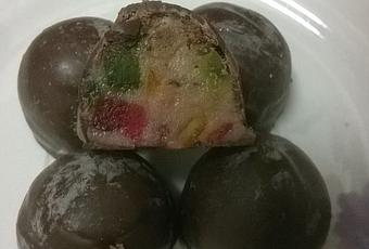 Retiramos los bombones de la nevera, pinchamos un palillo de los planos en cada bombón y lo introducimos en el chocolate girándolo para que quede totalmente cubierto, escurrimos el exceso y lo pinchamos en alguna superficie blanda, Los dejamos en la nevera hasta que el chocolate se solidifique.