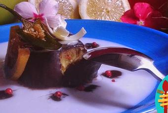 Vertemos un cucharón de leche de coco en un plato de postre. Con una cuchara pequeña ponemos 11 o 12 gotas de chocolate fundido. Con una brocheta hacemos una linea de arriba hacia bajo, hacia el interior del plato. Ponemos una pimienta roja sobre cada una de ellas.7.- Sobre el coulis de leche de coco, en el centro de las gotas ponemos un bombón. Decoramos con los chilis y la rodaja de limón caramelizada. Ponemos una flor de Begoña, con un pelador de verduras extremos unas laminas finas de chocolate blanco, las colocamos sobre el bombón y servimos.