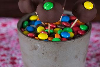 5. Lo metemos al congelador al menos un par de horas para que se congele. 6. Derretimos el chocolate junto con la manteca de cacao en el microondas, en tandas de 1 minuto. 7. Desmoldamos la mousse, retiramos el M&Ms y pinchamos en la base con un palillo, sumergimos en el chocolate derretido y colocamos con cuidado un M&Ms en el centro de cada flor. El chocolate, en contacto con la mousse helada se secará enseguida. * La manteca de cacao la encontrareis sin problema en herbolarios y/o farmacias ;)