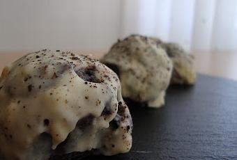Sacamos las bolitas del congelador y las cubrimos con el chocolate blanco. Antes de que se enfríen les añadimos las galletas que hemos reservado ralladas para decorar.