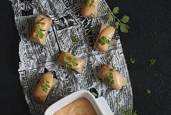 Yo he usado para hacerla bonito en aceite de oliva de Serrats y puedes imaginarte el resultado ¡maravilloso! Y unas salsas fantásticas y que nunca faltan en casa, la mayonesa y el ketchup Prima.Este aperitivo puede sacarte de muchos apuros este verano asi que toma buena nota de él y al lío.