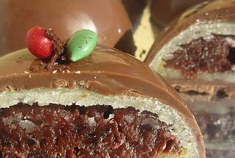 5- Montaje: Una vez endurecido el chocolate, formamos bolas de mazapán, espolvoreando la mesa con azúcar glas, aplastamos formando círculos y acomodamos dentro del molde, ponemos relleno de ciruelas y tapamos con otra base de mazapán. Fundir el resto de chocolate de nuevo, pues se habrá endurecido y cubrir los moldes con chocolate hasta el borde.