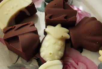 1 tableta chocolate con leche1 tableta chocolate blancoun poco de Dulce de Lecheunos moldes de silicona con formasPREPARACIÓN:derretir el chocolate, yo lo hago en el microondas, tener cuidado si no estáis acostumbrados, se puede quemar, hay que ir poco a poco, sino lo derretís al baño María, puse unos primero el chocolate blanco en el fondo del molde, en otros primero el de con leche, como mas o menos la mitad,