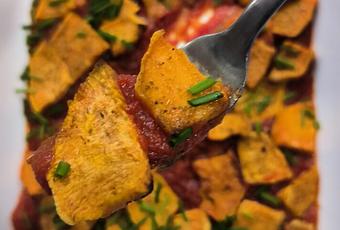 Maravillosa receta de boniato al horno acompañado de salsa de tomate, lima y cardamomo