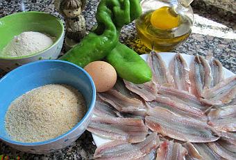 - Boquerones medianos 24 unidades (salen doce).- Pimientos verdes 2 (para que sobren).- Huevos 1.- Leche un poco (para ponerle al huevo).- Harina para emborrizar.- Pan rallado.- Aceite de oliva.- Sal.