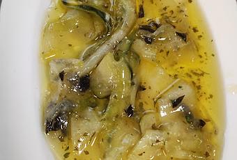 La receta es bastante similar a la original, aunque es mucho más corta, ya que no hay que congelar, ni blanquear los boquerones, basta con marinar las tiras de calabacín o pepino y luego añadir aceite, ajo y perejil.