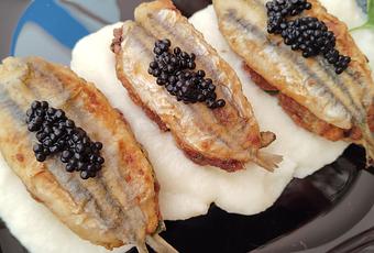 PARA SERVIR:Colocar una base de la crema de queso, sobre ella los boquerones rellenos y encima las huevas de arenques.