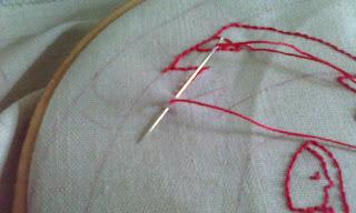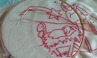 Hola, chicas!Así estoy, ya por el segundo bordado Redwork para esta Etapa 2...Quise también, aclarar que ademas de usar hilo rojo o bordó, queda muy bien bordar todo en punto pespunte! (otros le dicen punto atrás)