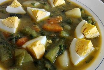 Pelar las patatas, cortarlas en trozos chascadas, pelar las zanahorias y cortarlas también en trozos.pelar y picar fino la cebolla y los ajos.Lavar y cortar en trozos las borrajas, no es necesario pelar ni quitar hebras, siendo tiernas.Poner en en una cazuela un poco de aceite, freír ligeramente la cebolla picada y añadir los ajos. picados.Poner en un cazo los huevos a cocer durante 7 minutos con una pizca de sal. Una vez cocidos, pelar, cortar en trozos y reservar.