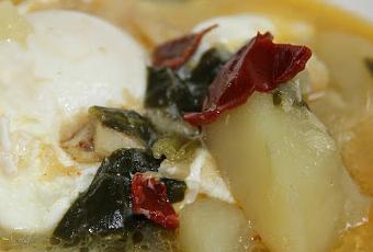 Paso 9: Ahora añadimos al puchero un huevo crudo cascado por comensal, de manera que los huevos quedan escalfados. En casa nos gustan con la yema blandita por lo que dejo la olla al fuego 3-4 minutos y apago. Si por el contrario nos gusta el huevo duro lo dejaremos cocer unos 6-7 minutos, siempre a gusto de cada uno.