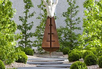 El elemento hacia el que se dirige la mirada es una escultura de Jesús Cuirá. Domina el jardín, por su porte y expresión rotunda. Esta obra de arte está realizada en piedra y acero corten, una combinación interesante de texturas y cromatismos.
